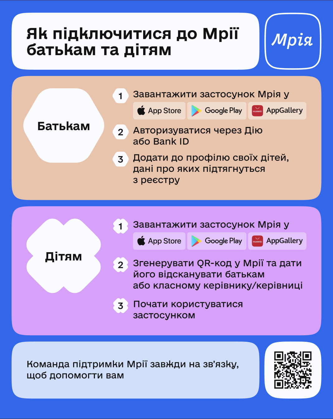 Учням будуть відображатись всі дані, які вчителі вноситимуть у систему: розклад, оцінки з коментарями від учителів, домашні завдання. Якщо виникнуть будь-які питання або складнощі з підключенням, будь ласка, не хвилюйтеся. Одразу звертайтеся до служби підтримки Мрії — https://t.me/mriia_support_bot. Її агенти завжди готові допомогти вам розібратися з будь-якими труднощами
